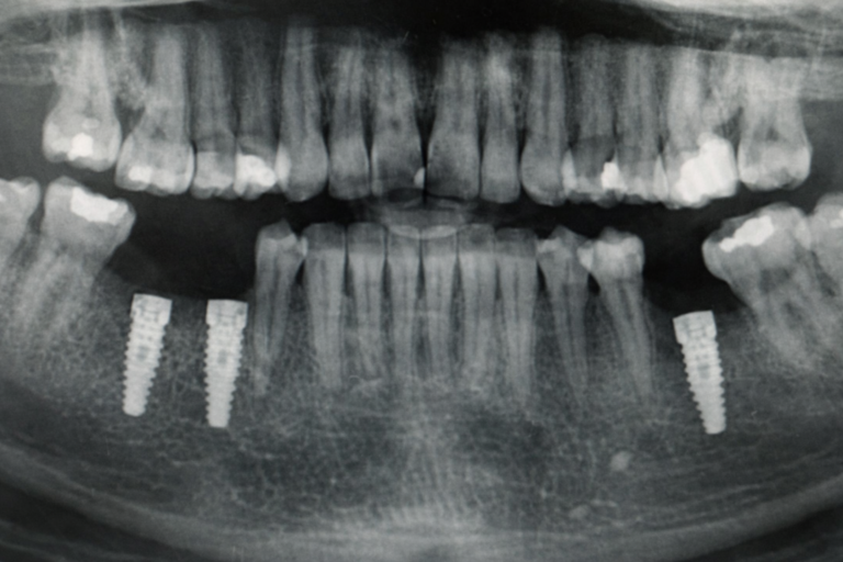 1. Tomografía o radiografía final para revisión de fase previa. Aquí lo que vamos a revisar es la recuperación, la cicatrización del hueso alrededor de los implantes, estabilidad del mismo, evaluar si hay infecciones que deban ser tratadas o controladas.